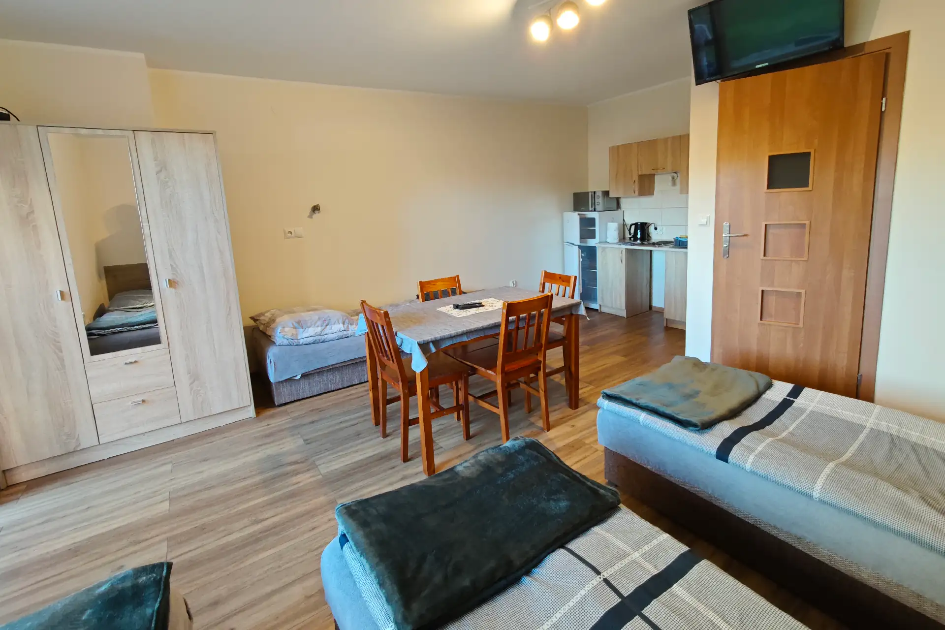 Przestronne pokoje o powierzchni ok. 30 m² wraz z łazienką i WC przeznaczone są dla 3-4 osób. W pokojach znajduje się telewizor LCD, duża szafa, aneks kuchenny w tym lodówka, kuchenka i czajnik elektryczny.