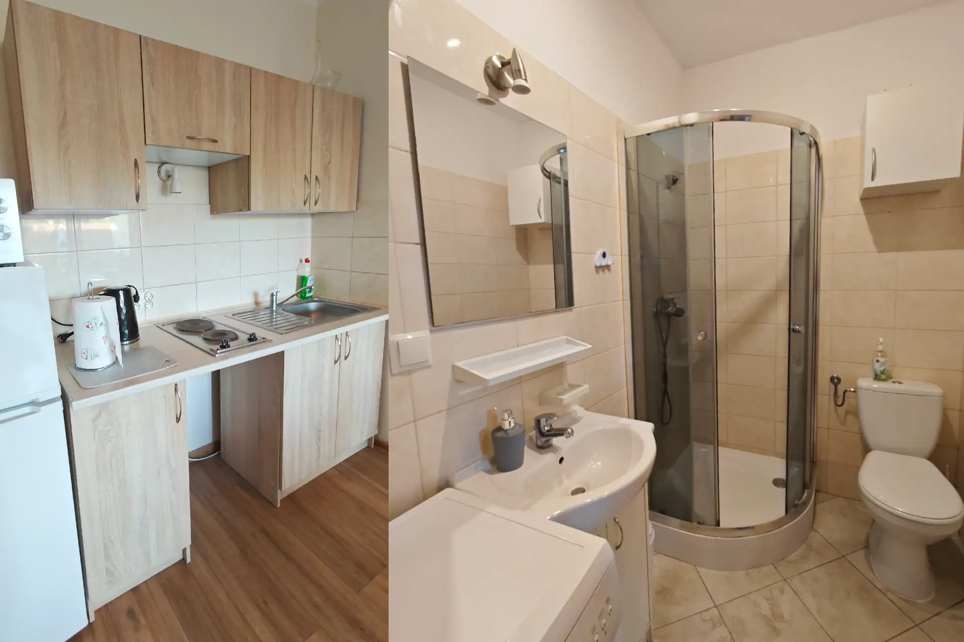 Łazienka i WC wyposażona jest w przestronny prysznic i pralkę, dzięki czemu w pokojach można zaplanować dłuższy pobyt.